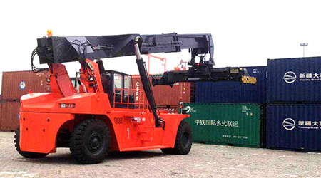 2002年,大连叉车设计出45吨正面吊运机并投入生产,至今已有13年生产开发史。CRS450Z5型正面吊运机是专门为20英尺和40英尺国际集装箱设计的,主要应用于集装箱的堆叠和码头、堆场内的水平运输,于叉车相比,它具有机动灵活,操作方便,稳定性好的特点。CRS450Z5型正面吊运机特别适用于中小港口,铁路中转站和公路中转站的集装箱装卸,也可在大型集装箱码头作为辅助设备来使用。整车设计高标准、高性能,在作业时可同时实现整车行走、变幅、臂架伸缩动作,具有较高的工作效率。原装沃尔沃或康明斯发动机,燃油消耗低,符合欧Ⅲ排放标准,具有全天候易启动的特点,保证车辆发挥其最大功率和最佳效率。变速箱、驱动桥、电器系统控制部分和液压系统工作油泵、液压阀块等主要零部件均采用进口高端优质部件,保证产品质量,属具采用进口“ELME”型吊具,设计可使用200万次以上。今年来该产品已经服务于全国多个地区的港口码头和铁路系统,并且远销海外,深受国外客户的青睐。